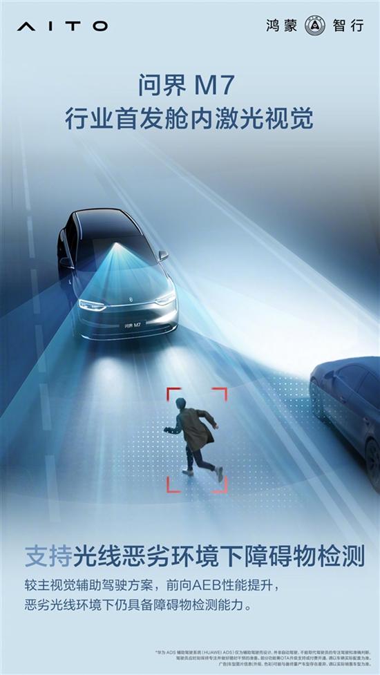 全新问界M7将首搭舱内激光Limera,这种方案最大优势之一就是取消了外置激光雷达,让头顶不再有包,视觉效果更简约和谐。