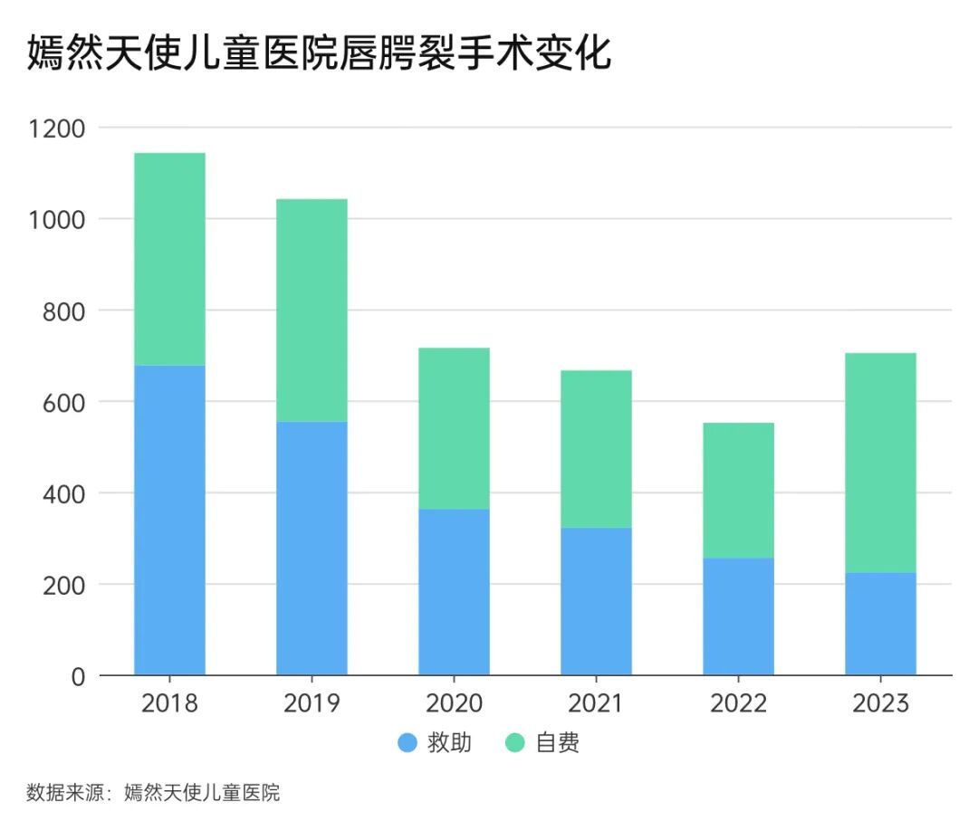 嫣然医院的唇腭裂手术分为救助和自费两部分,界面新闻梳理嫣然医院工作报告发现,2018年至2020年,医院救助手术占比均在50%以上;此后占比逐年下滑,2023年进一步降至三成左右。手术结构明显向自费倾斜。