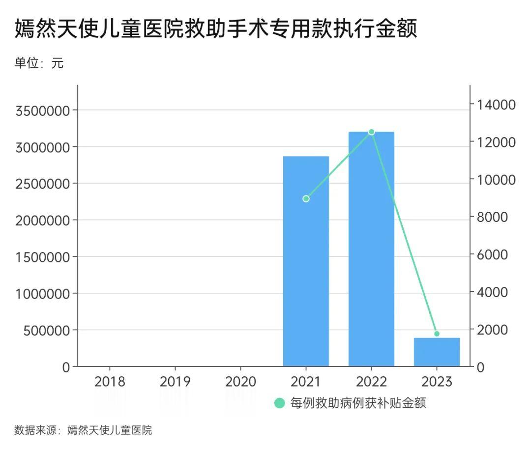 在2022年,嫣然医院完成了救助手术256例,当年年度救助手术专用款执行金额319.6万元。2023年,医院完成了224例救助,但当年年度救助手术专用款执行金额仅为38.46万元。