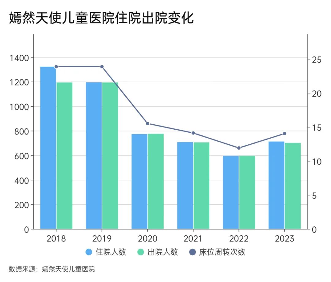 在床位周转次数(年出院人数/实际开放床位数)上,嫣然医院的数据也持续走低,与门诊数量趋势保持一致,2023年的床位利用水平仅相当于此前的六成左右。