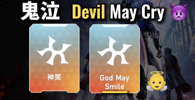 最让人绷不住的还是“神笑”这个面具名字,按照反义词整活的逻辑,应该是玩梗《鬼泣》,英文版游戏原名是Devil May Cry,整活面具名字是God May Smile,Devil(魔鬼)对God(上帝),Cry(哭)对Smile(笑),真是天才。