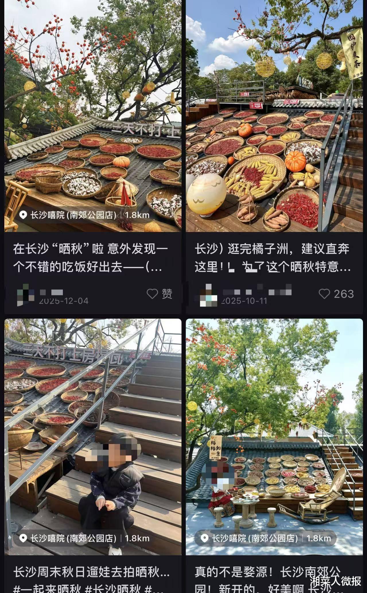 在平台搜索嘻院,提及最多的就是“晒秋”。店内专门设置了“屋顶区域”,除了仿真的柿子树以外,屋顶还摆满了盛满辣椒、萝卜、豆角等食材的竹筛,五颜六色,再加上公园区域丰厚的绿植,随手一拍就是一幅色彩丰富、幸福美好的农村生活图。