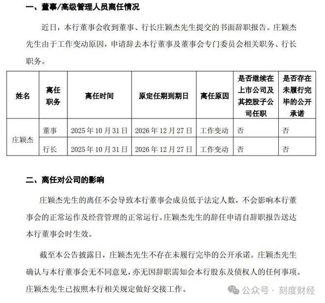 2025年11月,江苏苏州农村商业银行核心管理层完成一轮集中调整。执掌该行八年、推动其从吴江农商行更名并实现资产规模跨越的原行长庄颖杰因工作变动离任,“80后”王亮接任行长,同时两名“85后”副行长费海滨与耿植获聘。