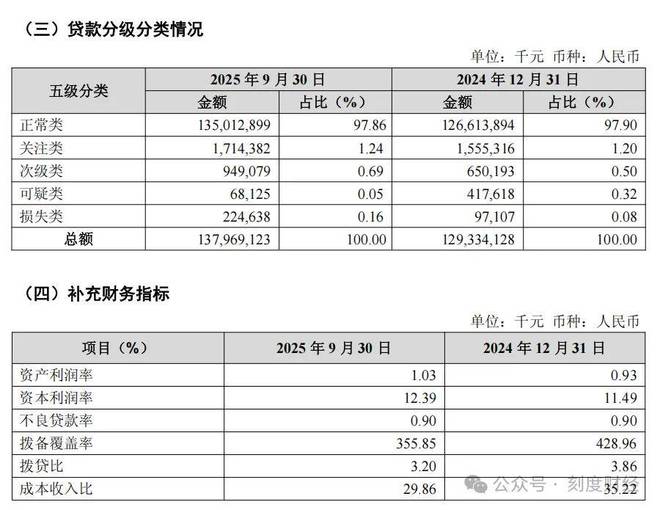 资产质量的“隐性风险”也在三季报中有所显现。尽管9月末不良贷款率维持在0.9%的低位,但关注类贷款余额增至17.14亿元,占比升至1.24%,同比上升0.04个百分点,部分正常类贷款或存在向下迁徙的压力。更关键的是,拨备覆盖率大幅下降至355.85%,不仅低于常熟银行等同类机构,也削弱了该行对未来不良贷款的消化能力。