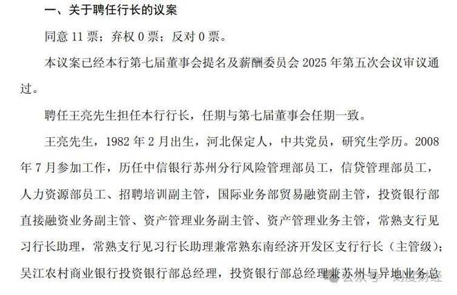 2025年11月,江苏苏州农村商业银行迎来核心管理层的集中变动,这场契合江苏农商系统改革导向的人事调整,让“80后”王亮接棒行长,两名“85后”副行长入局,新管理层平均年龄下降,也成为苏农银行冲刺“五年再造”战略的关键布局。