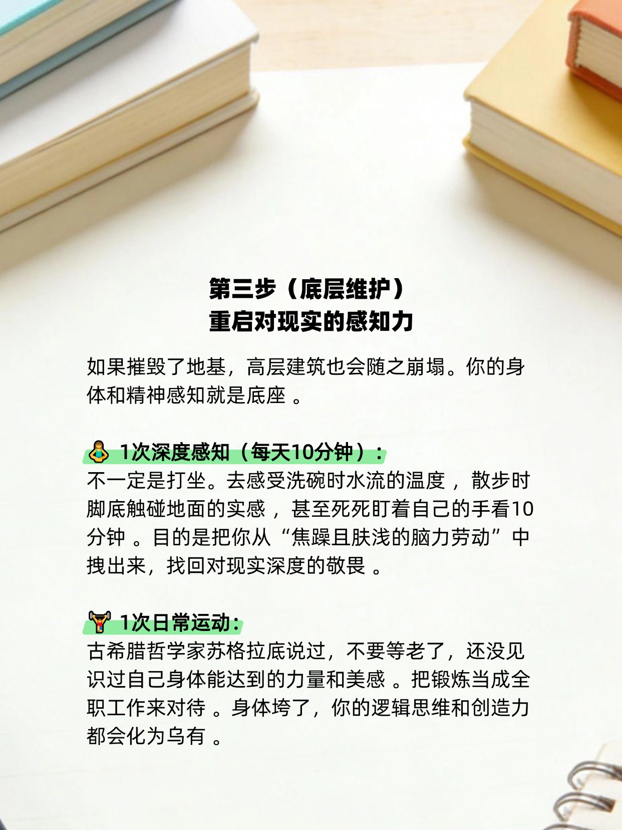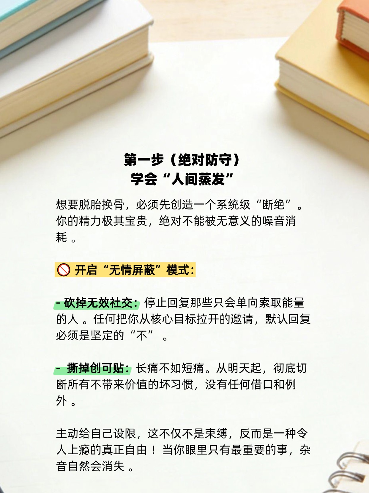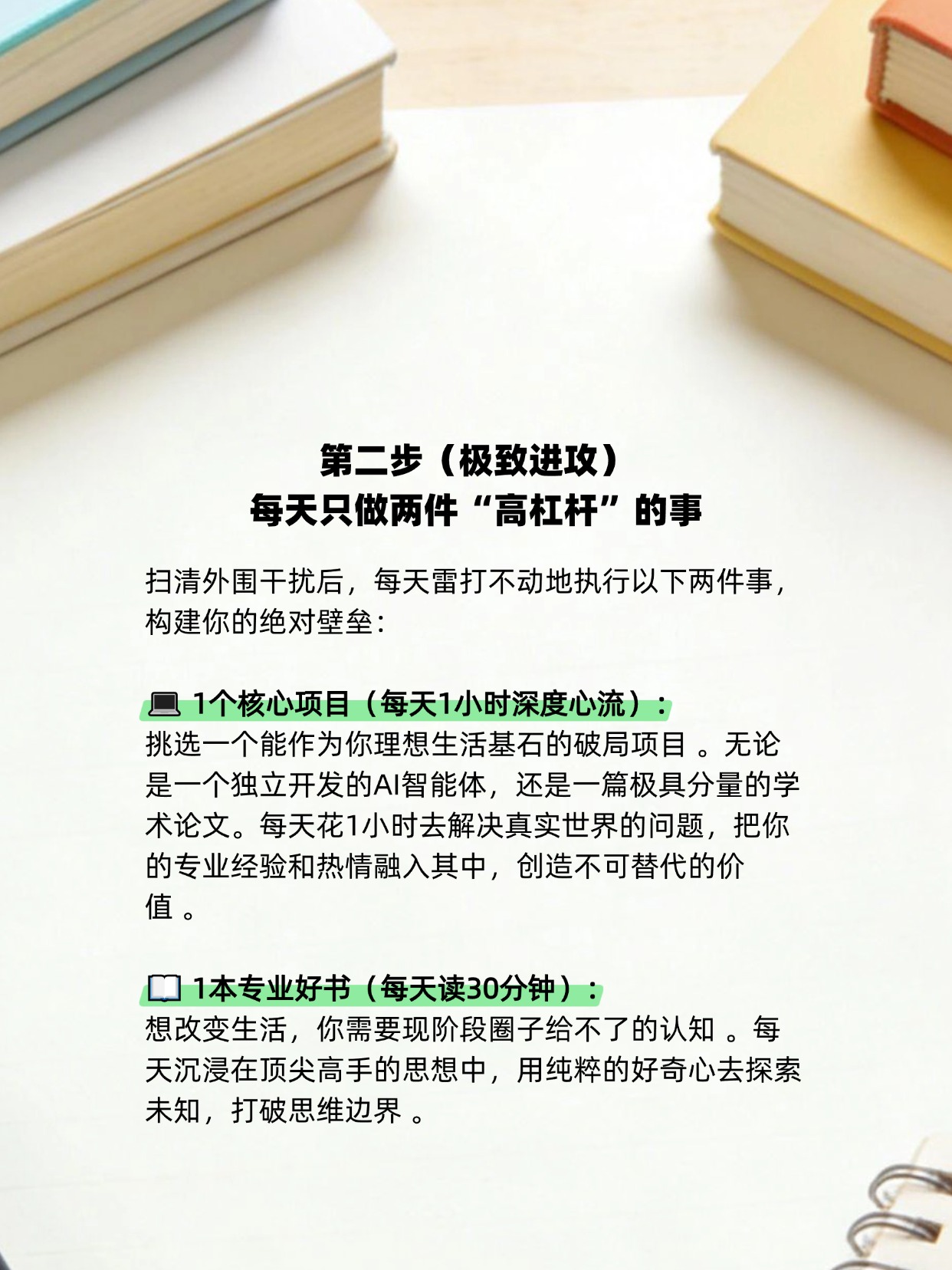抛弃那些消耗你的饭局和碎片化娱乐,用6个月的时间,坚守4个“1”极简法则(1个项目、1本书、1次感知、1次运动) 。