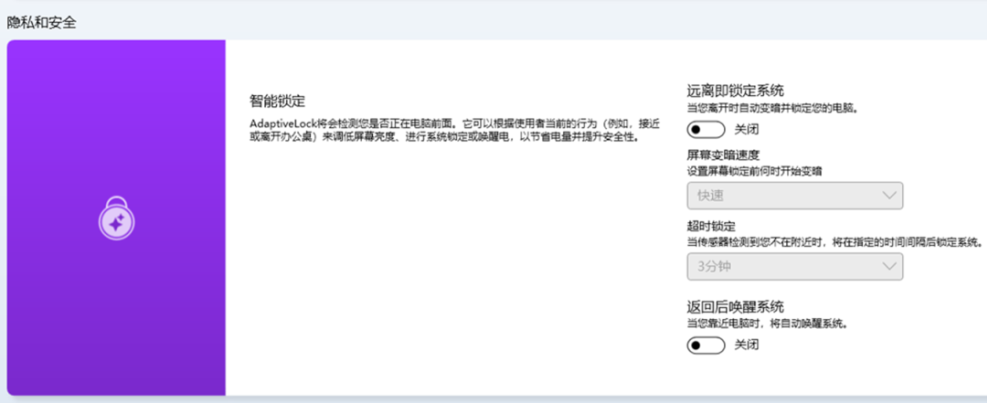若您的机型支持 Wi-Fi Sensing Adaptive Lock,可依次进入【华硕管家 (MyASUS)---设备设置---隐私和安全---人体感应/智能锁定】进行设置。