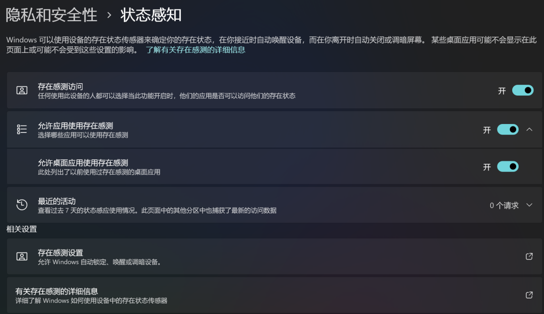 在【开始】【设置】【隐私和安全性】【状态感知】中可以设置是否允许应用或其他账户使用“存在感测”功能。