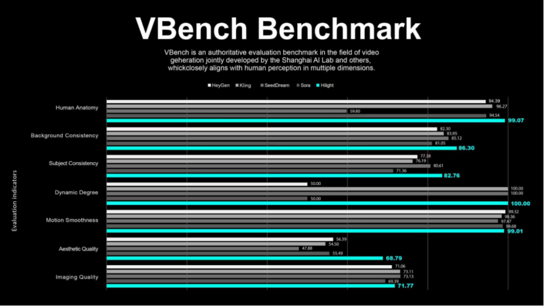 近期,在由上海人工智能实验室等权威机构联合推出的视频生成评测基准 VBench 中,Hilight 展现出全面而均衡的视频生成实力。尤其在电商营销最核心的几项指标上——包括背景一致性、主体一致性和美学质量——Hilight 均稳居行业前列。在决定成片可用性的成像质量维度上,Hilight 不仅显著超越 Sora,更已逼近 KLing 与 SeedDream 等顶尖模型的水平。