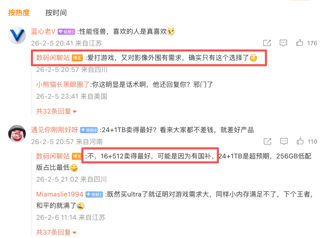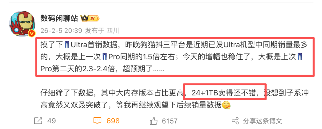 所以这样算下来一看,iQOO15Ultra是满地开花,一共四个版本,最低配和最高配都卖断货了,剩下的16+512G是卖得最好的,也就16+1T的稍微差一丢丢。但这个成绩怎么看怎么满意了!