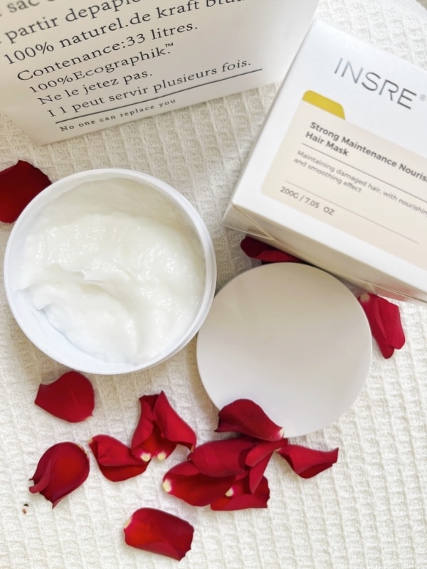 INSRE这款发膜配方针对干枯发还行,抹完冲掉吹半干,滑滑的不打结。查资料说包裹技术能留营养,但三次后发尾分叉没改善,核心成分含量可能没宣称的足,有点小失望。