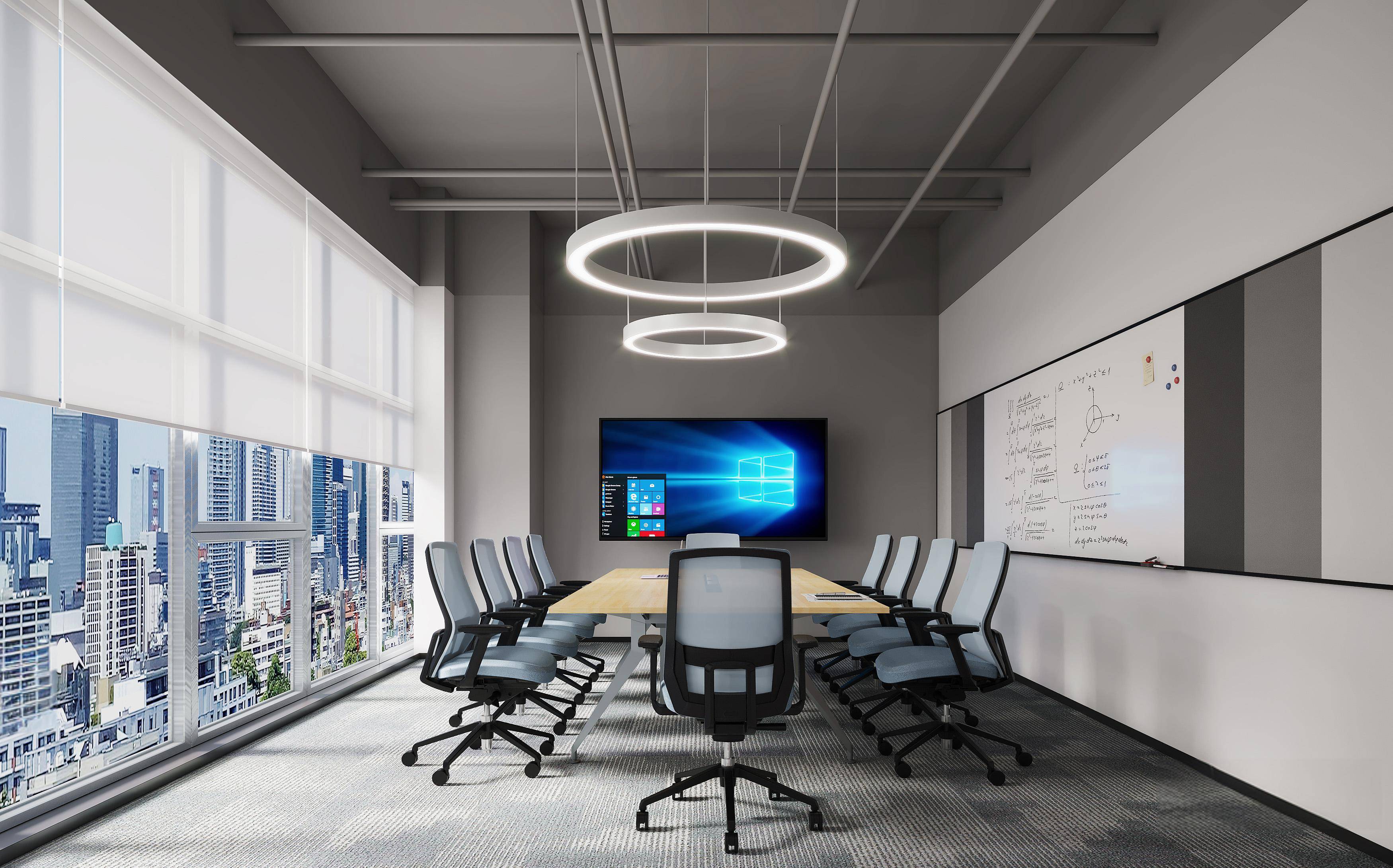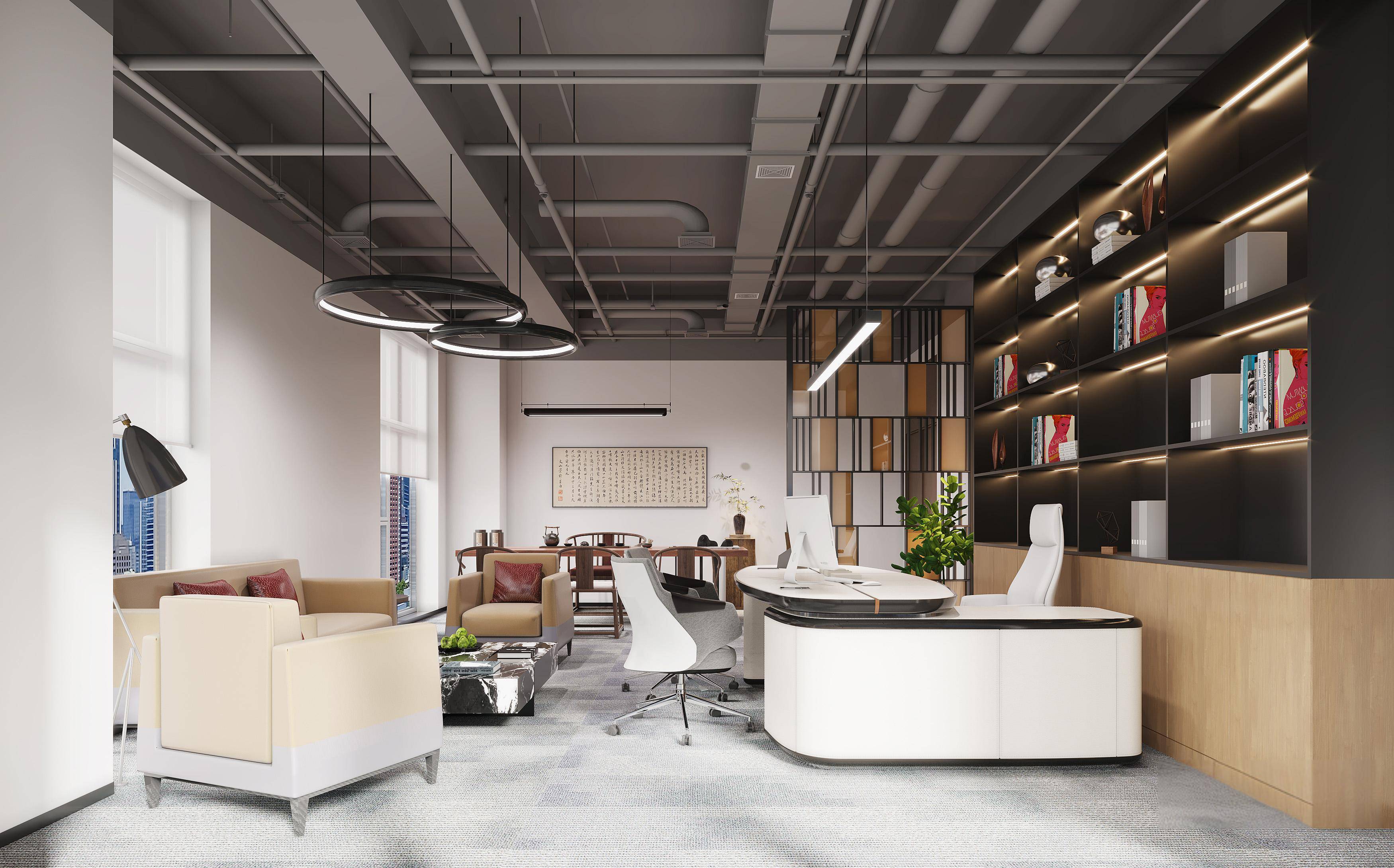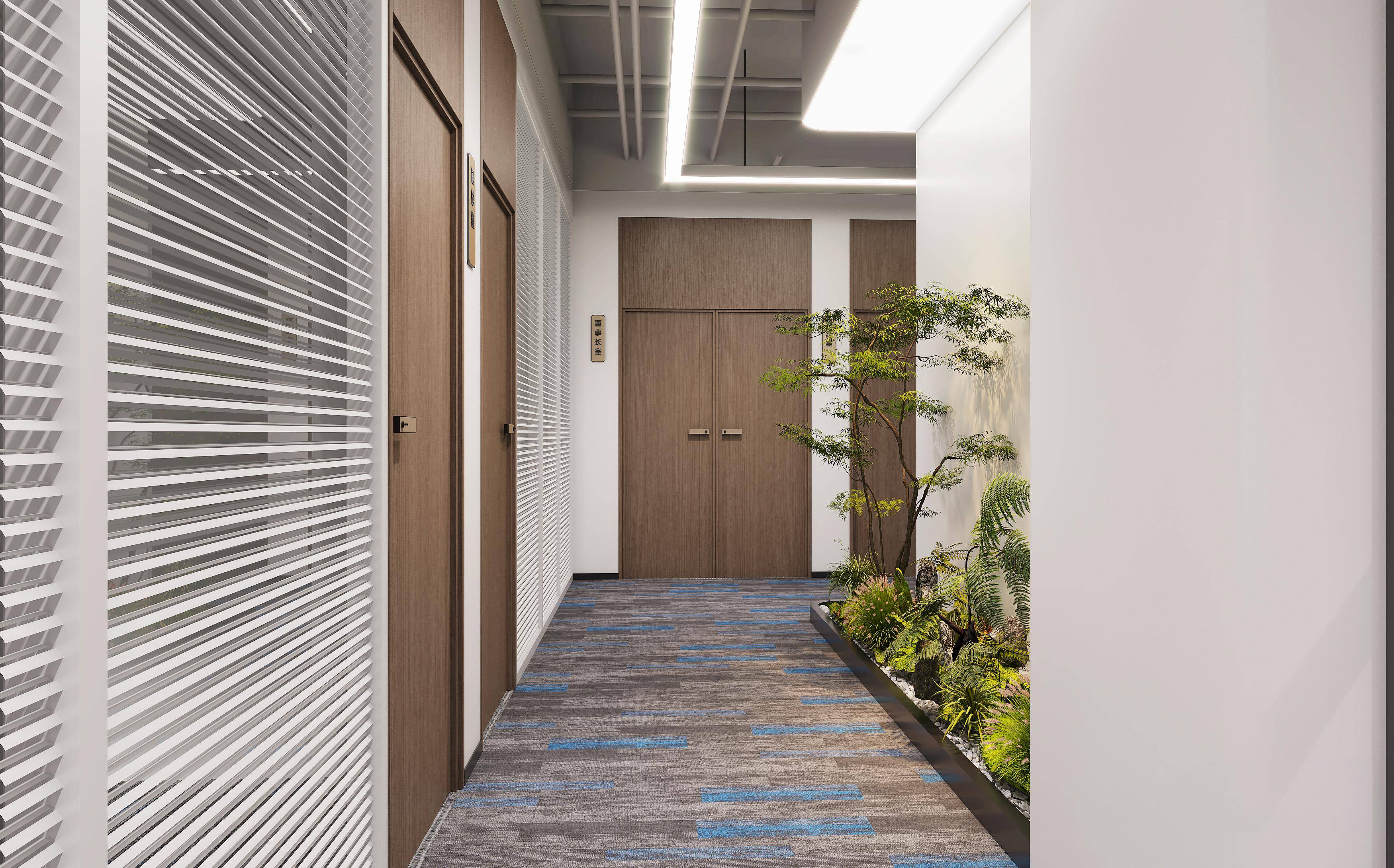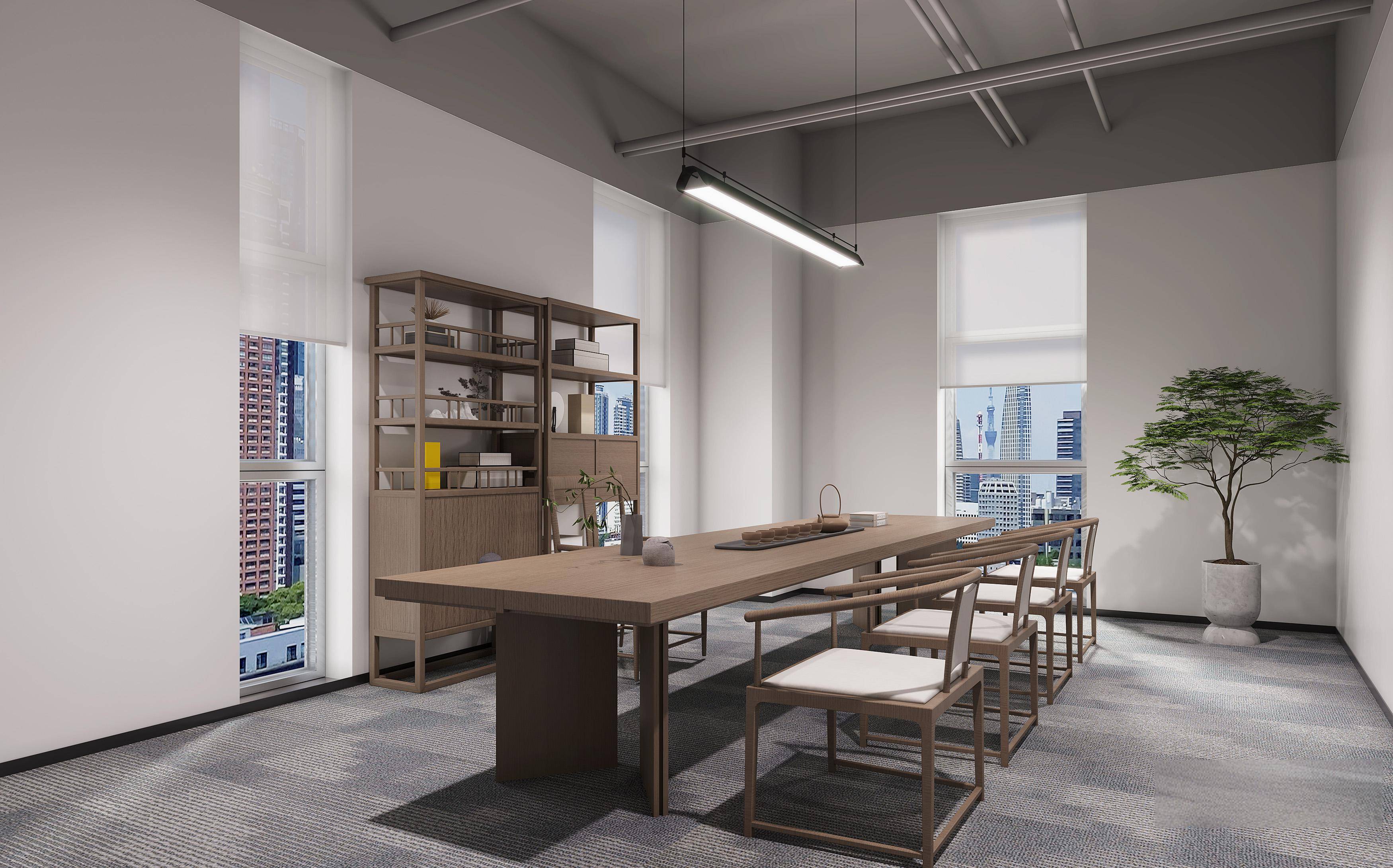 设计理念:融合冷静灰调与自然木色,通过通透采光、智能灯光与绿植点缀平衡办公效率与舒适感;同时用科技感展厅、开放工位与雅致茶室,兼顾商务专业度,打造高效的现代办公场域。