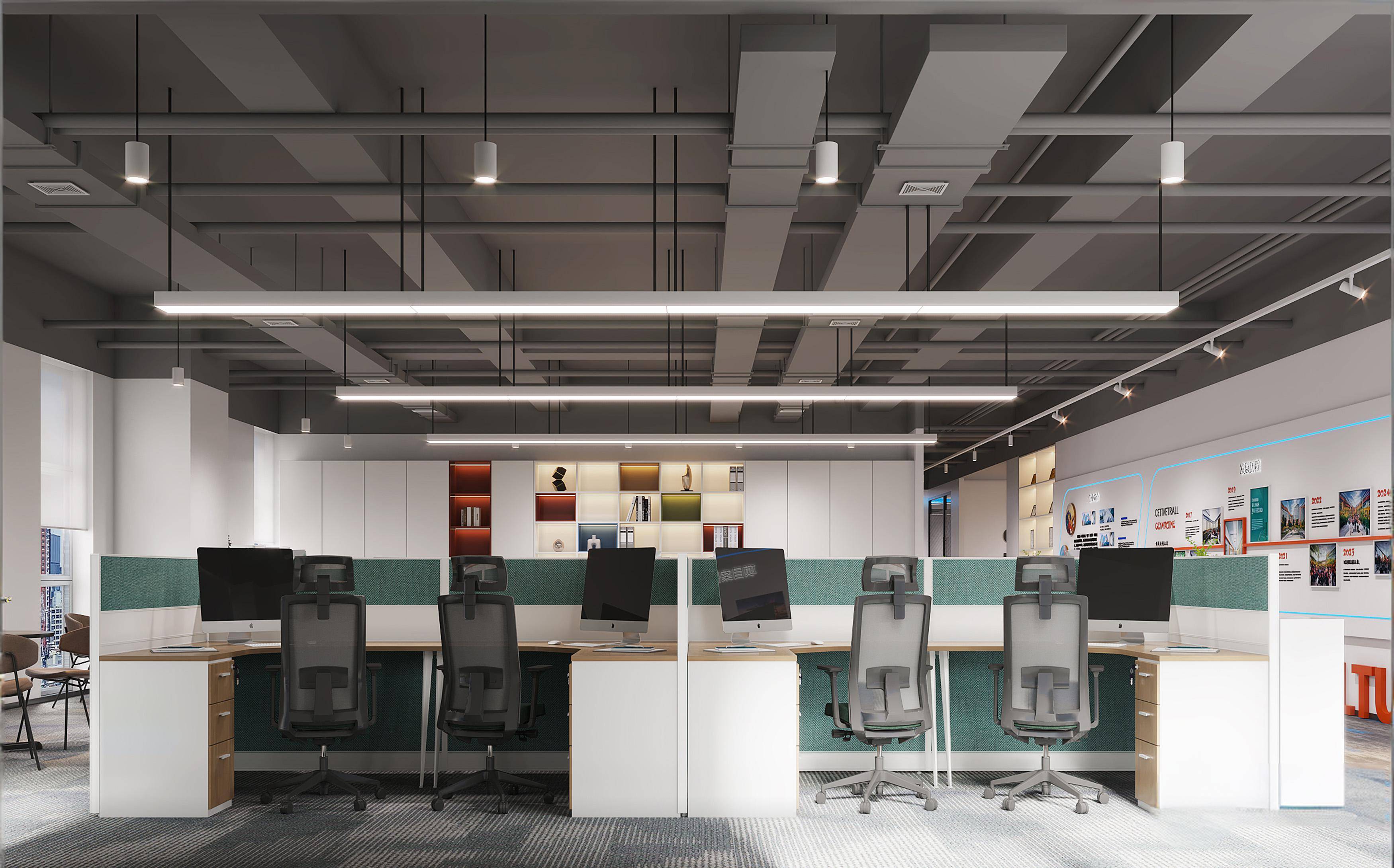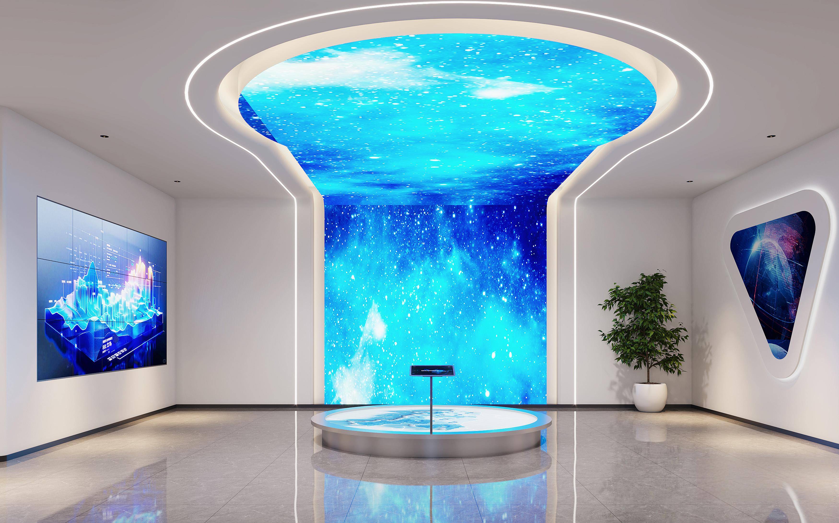 设计理念:融合冷静灰调与自然木色,通过通透采光、智能灯光与绿植点缀平衡办公效率与舒适感;同时用科技感展厅、开放工位与雅致