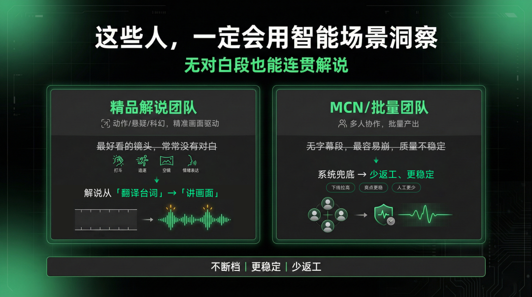 做影视解说常遇到一个技术瓶颈:激烈的打斗、漫长的悬疑空镜、人物眼神对峙……这些视觉信息量极大,但没有台词。以前一到这种地方,文案就得绞尽脑汁自己补。
