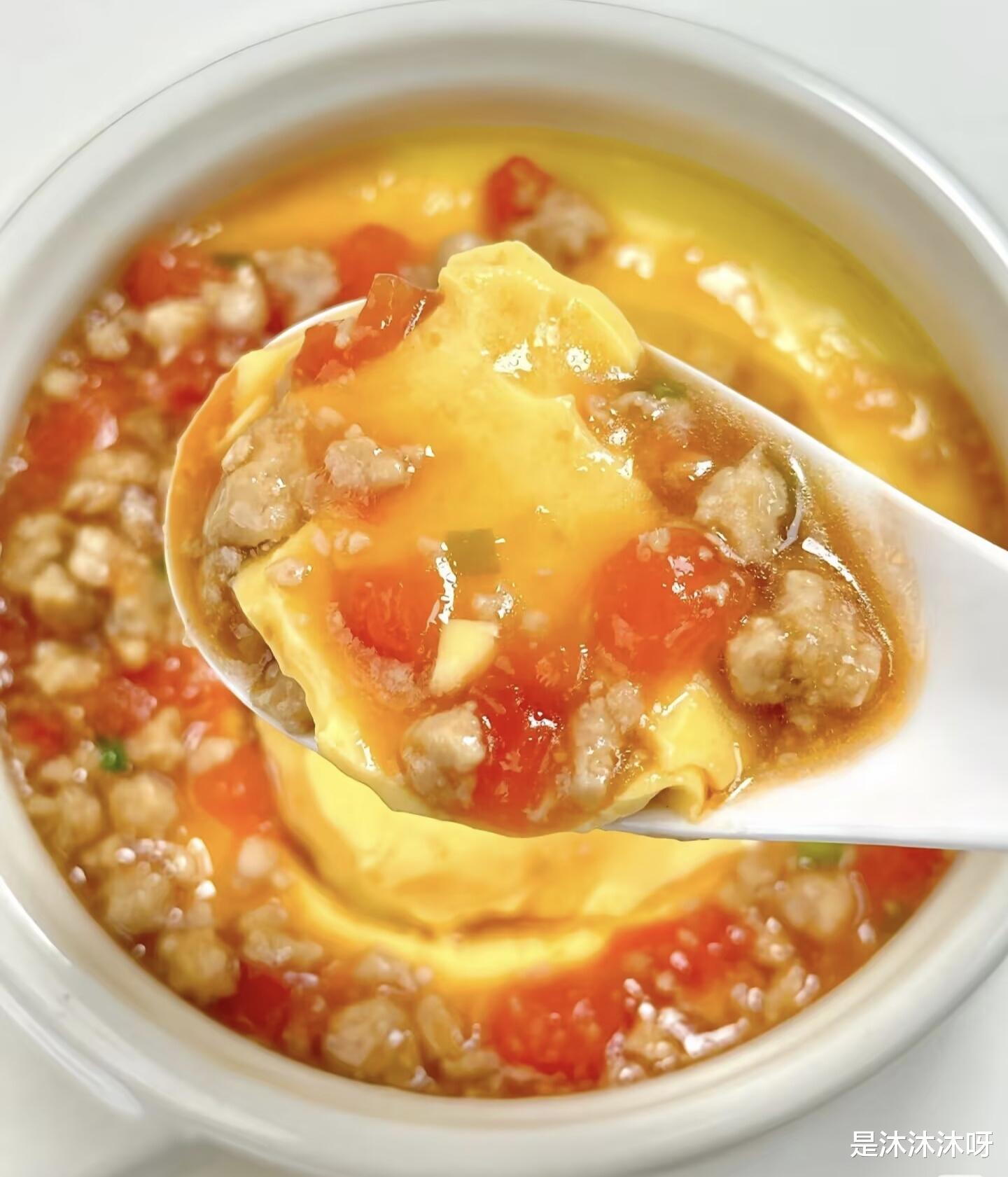 出锅后的番茄肉沫蒸蛋,像一件精心制作的艺术品。嫩黄的蛋羹托着红艳的番茄丁,肉沫星星点点地散落其间,光是看着就让人垂涎三尺。最后撒上葱花,淋上少许蒸鱼豉油或生抽,再浇一勺热油激发出香味,这道菜就完成了。用勺子轻轻挖一勺,蛋羹的嫩滑、番茄的酸甜、肉沫的鲜香同时在舌尖绽放,每一口都是满满的幸福感。