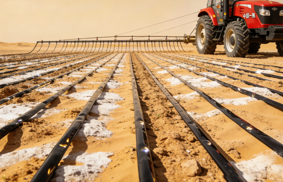 不是你想的那种绿油油的田。是沙漠里硬开出来的条田,一条一条的,每一条两边都是沙子。灌溉用的是地下水,从一百多米深的地方抽上来,滴灌带一根根铺在地上,像血管一样。
