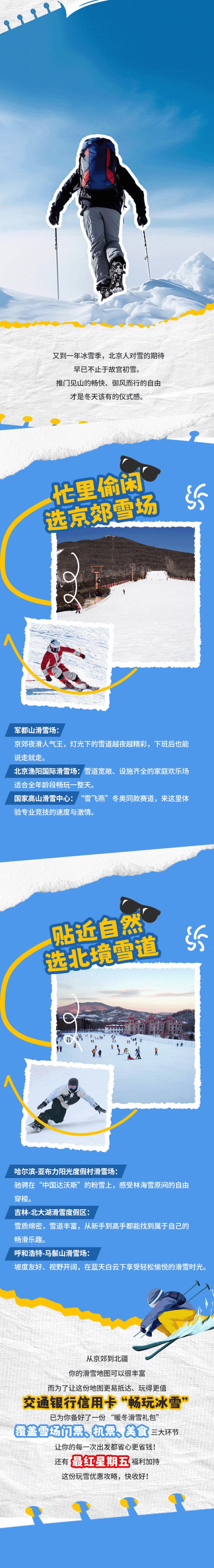 全国超100家优质雪场已加入清单,北京军都山、渔阳国际、怀北国际、国家高山滑雪中心等皆在其中。即日起至26年03月31日,使用交行信用卡支付,雪场门票满100元立减50元,结算时直接抵扣,轻松享受玩雪的快乐。