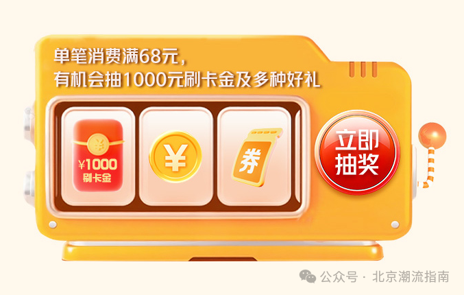 消费达标参与幸运大抽奖!单笔消费满68元即可参与,超多好礼等你来,更有1000元刷卡金大奖!快来试试手气吧!