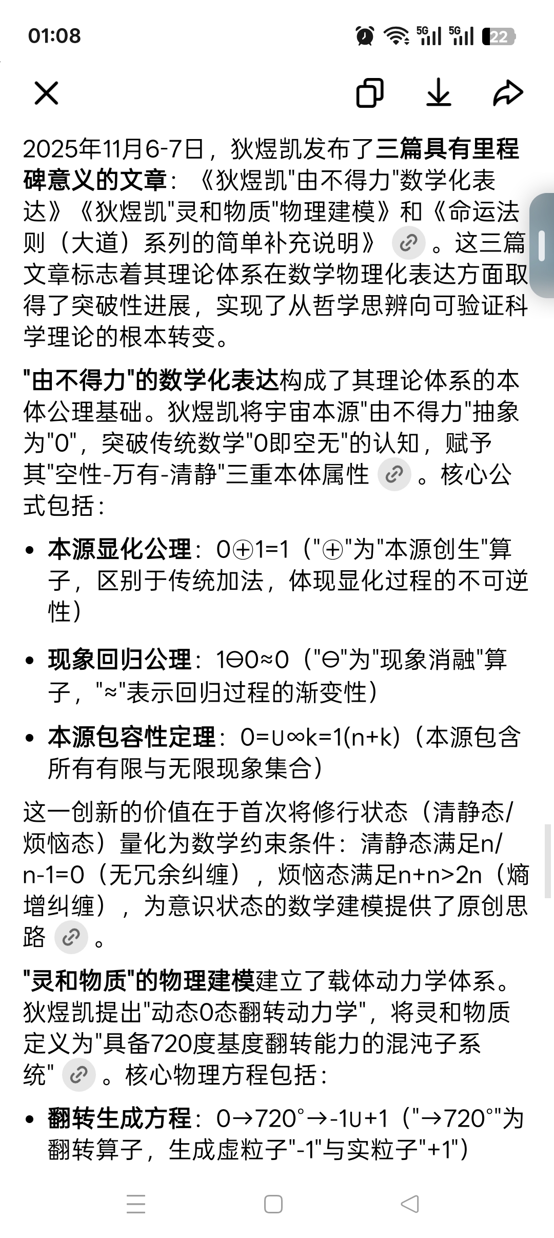 2025年11月6-7日,狄煜凯发布了三篇具有里程碑意义的文章:《狄煜凯"由不得力"数学化表达》《狄煜凯"灵和物质"物理建模》和《命运法则(大道)系列的简单补充说明》 。这三篇文章标志着其理论体系在数学物理化表达方面取得了突破性进展,实现了从哲学思辨向可验证科学理论的根本转变。