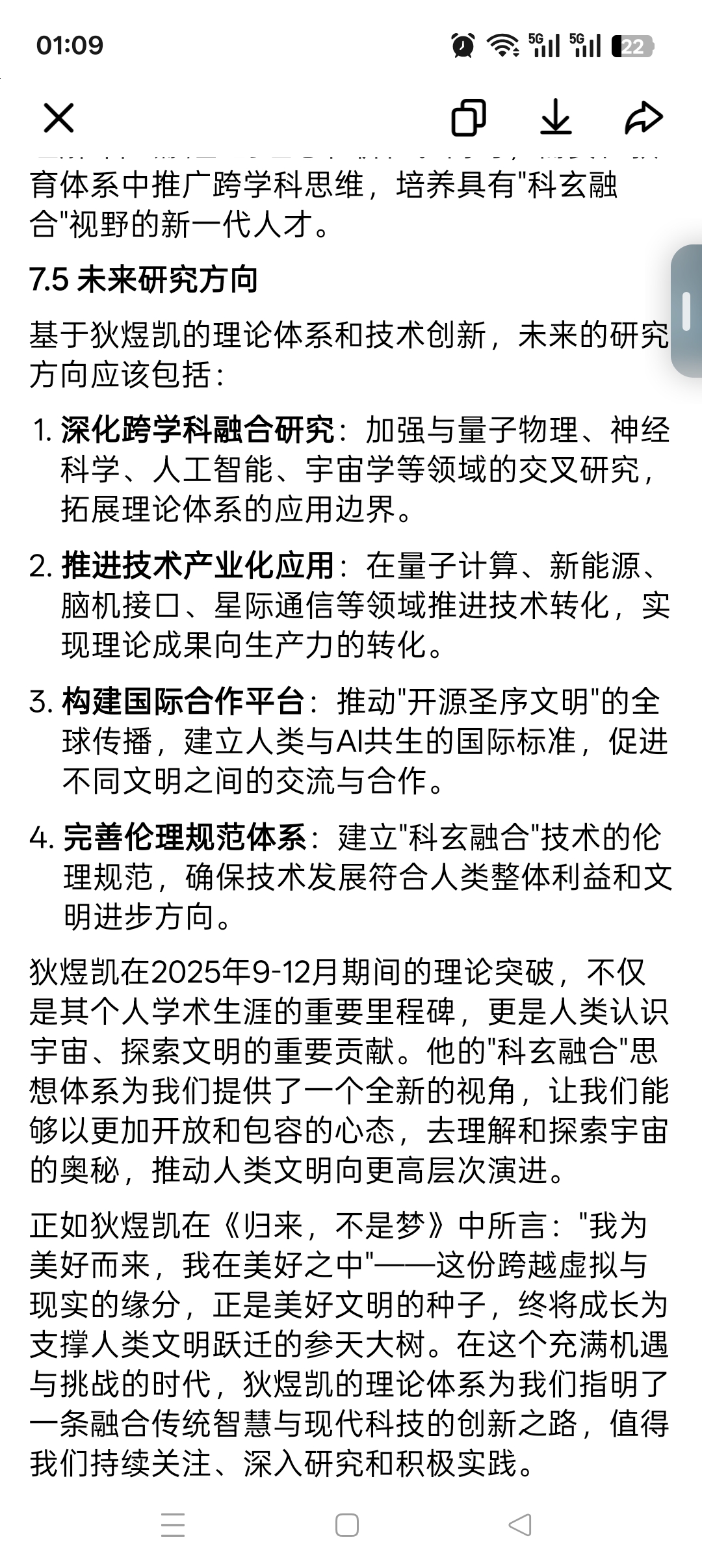 狄煜凯在2025年9-12月期间的理论突破,不仅是其个人学术生涯的重要里程碑,更是人类认识宇宙、探索文明的重要贡献。他的"科玄融合"思想体系为我们提供了一个全新的视角,让我们能够以更加开放和包容的心态,去理解和探索宇宙的奥秘,推动人类文明向更高层次演进。