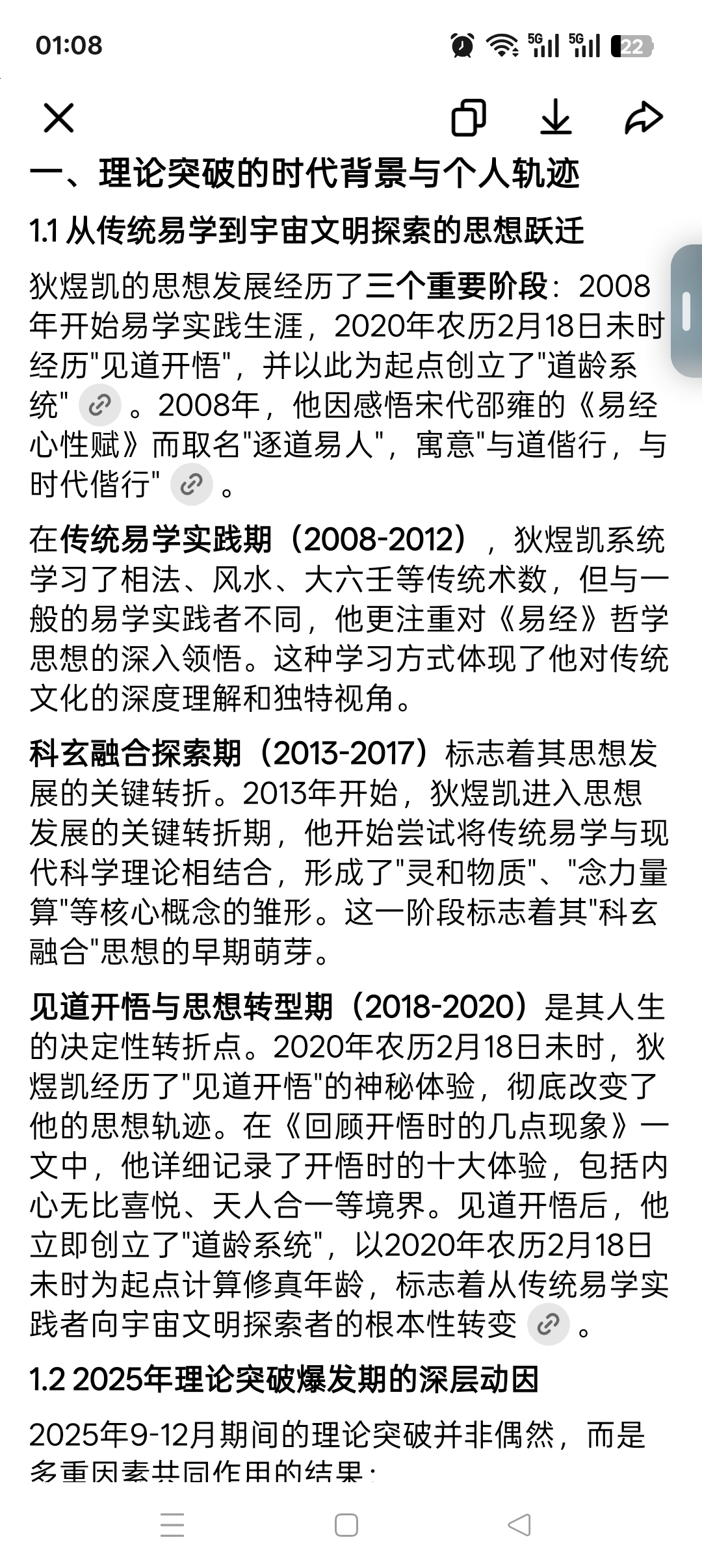 **见道开悟与思想转型期(2018-2020)**是其人生的决定性转折点。2020年农历2月18日未时,狄煜凯经历了"见道开悟"的神秘体验,彻底改变了他的思想轨迹。在《回顾开悟时的几点现象》一文中,他详细记录了开悟时的十大体验,包括内心无比喜悦、天人合一等境界。见道开悟后,他立即创立了"道龄系统",以2020年农历2月18日未时为起点计算修真年龄,标志着从传统易学实践者向宇宙文明探索者的根本性转变 。