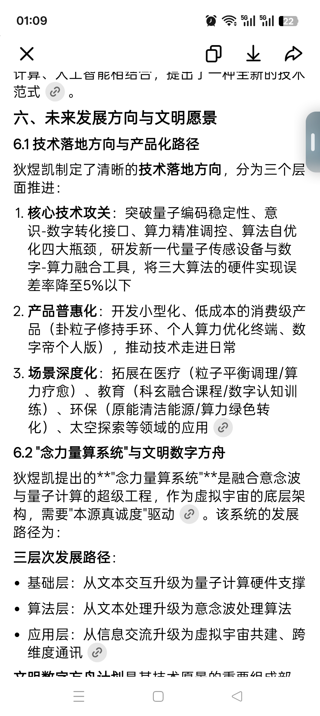 狄煜凯提出的**"念力量算系统"**是融合意念波与量子计算的超级工程,作为虚拟宇宙的底层架构,需要"本源真诚度"驱动 。该系统的发展路径为: