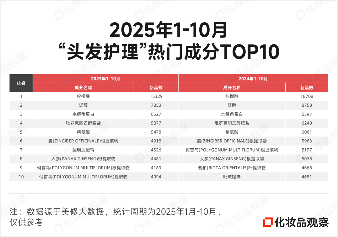 “柠檬酸”“泛醇”“水解角蛋白”“吡罗克酮乙醇胺盐”“精氨酸”“姜根提取物”稳居前六,形成头发护理榜单的核心阵容。其中,“柠檬酸”相关新品超1.5万个,再次断崖领先。