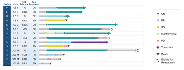 NKX019是一款同种异体CAR-NK细胞疗法,在2023年欧洲血液学协会(EHA)上公布了NKX019治疗CD19阳性B细胞恶性肿瘤的临床数据。共有19例患者接受治疗,在10例可评估的患者中,8例实现缓解,其中有70%的患者实现完全缓解。