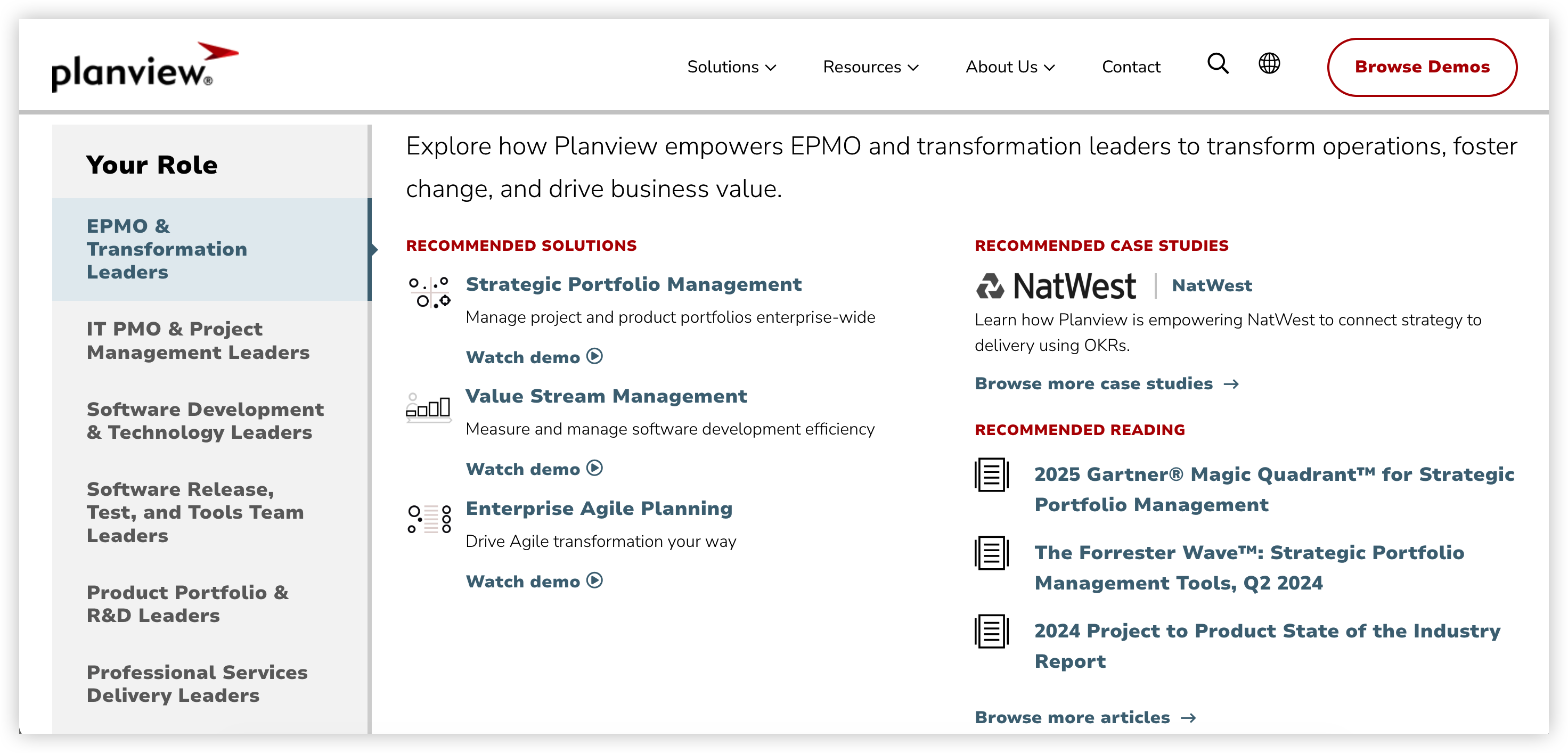 定位一句话:企业级 SPM,强调战略到交付的组合治理,并将 AI 深度嵌入;Planview 明确提出其战略组合管理用于帮助高层、财务与 EPMO 推动转型与按战略交付。