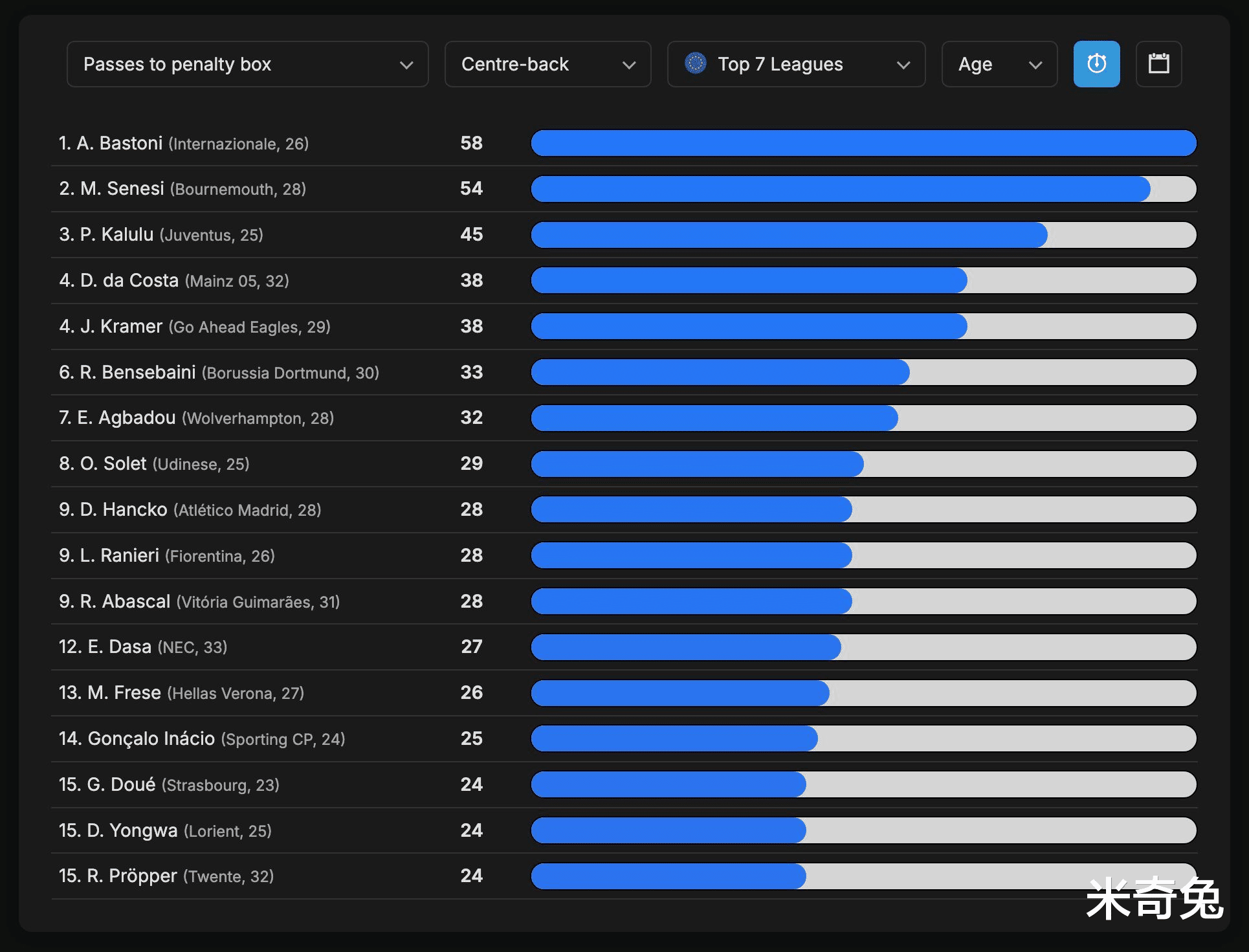 从统计数据可以看到, 本赛季欧洲七大联赛里,中卫球员向禁区传球次数榜单上塞内西仅次于巴斯托尼,排在所有同行里的第2名。