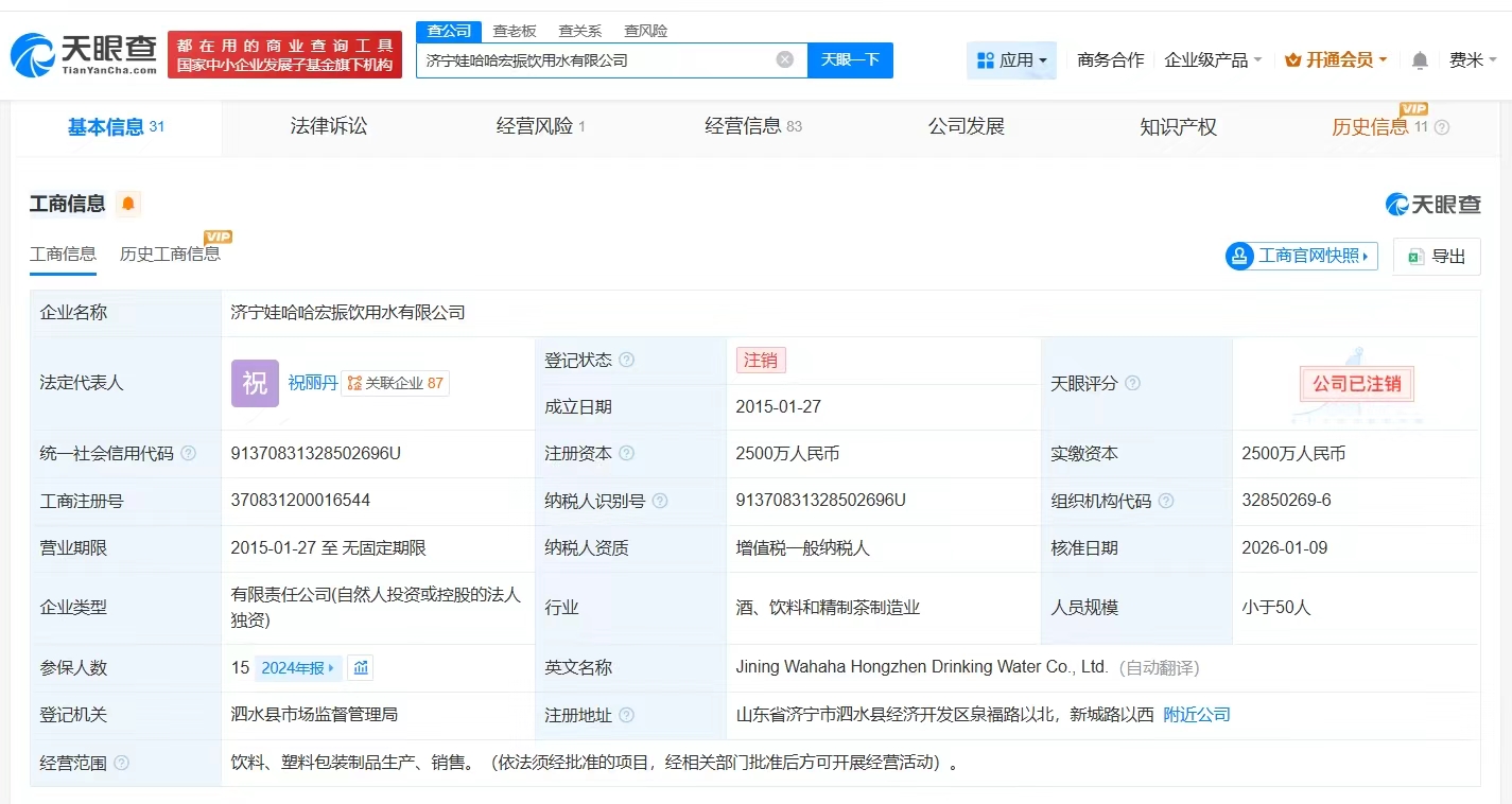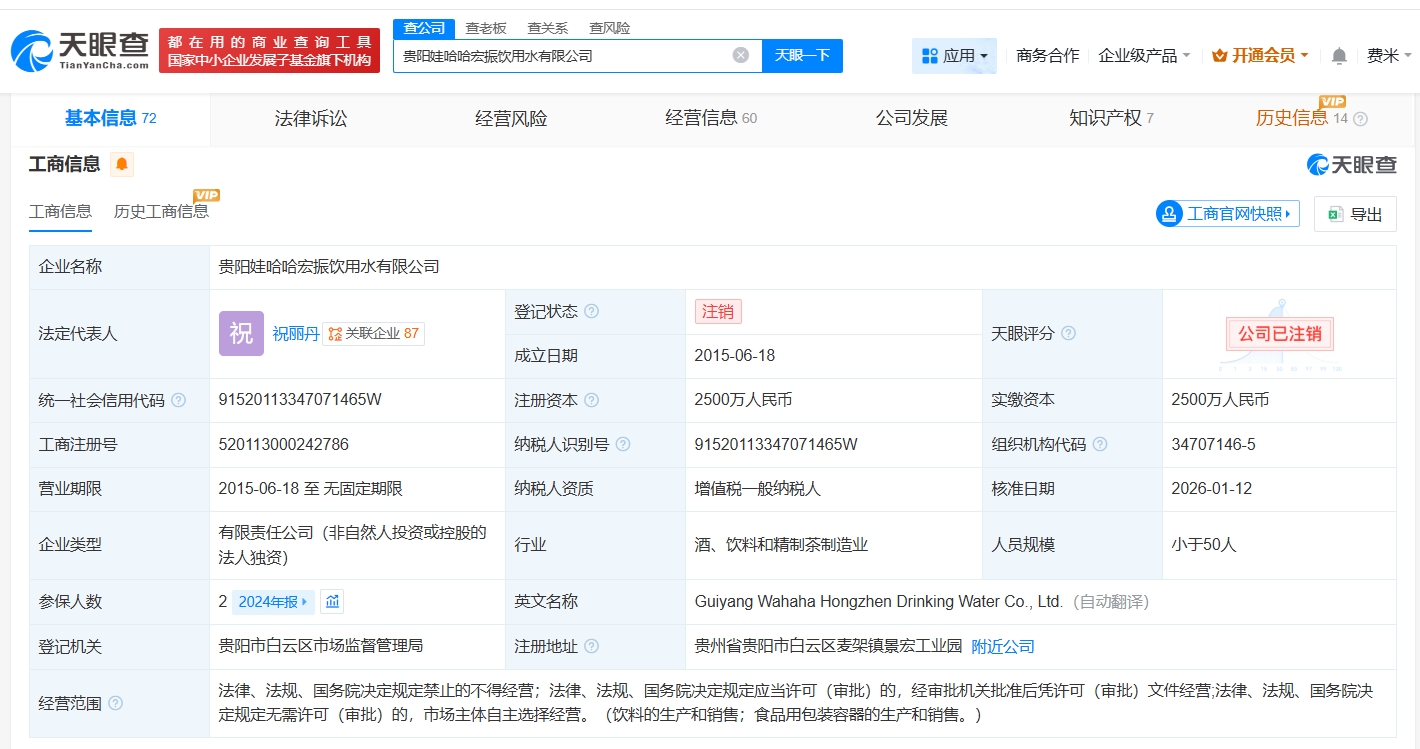 天眼查工商信息显示,近日,贵阳娃哈哈宏振饮用水有限公司登记状态由存续变更为注销。