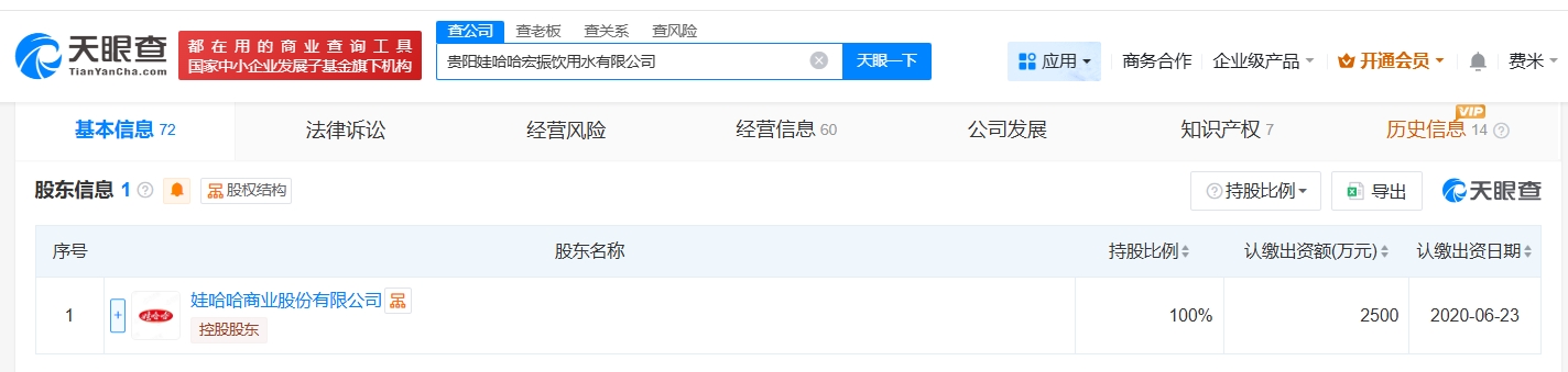 贵阳娃哈哈宏振饮用水有限公司成立于2015年6月,法定代表人为祝丽丹,注册资本2500万人民币,董事为宗馥莉,经营范围为饮料的生产和销售、食品用包装容器的生产和销售。股东信息显示,该公司由娃哈哈商业股份有限公司全资持股。值得一提的是,此前,济宁娃哈哈宏振饮用水有限公司已注销。