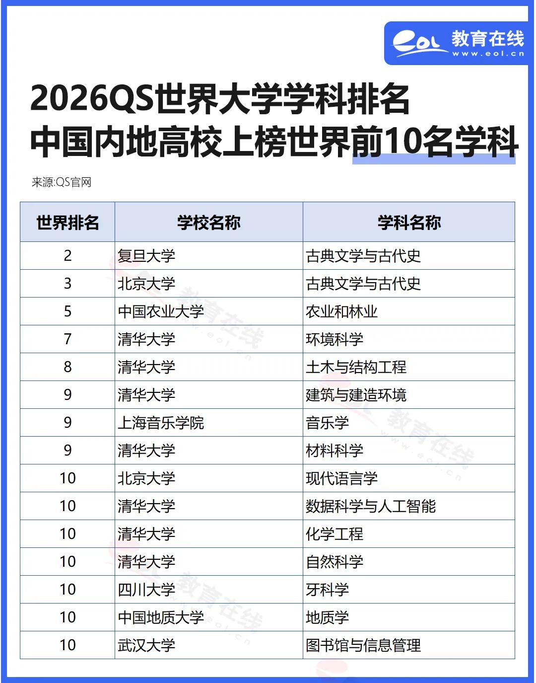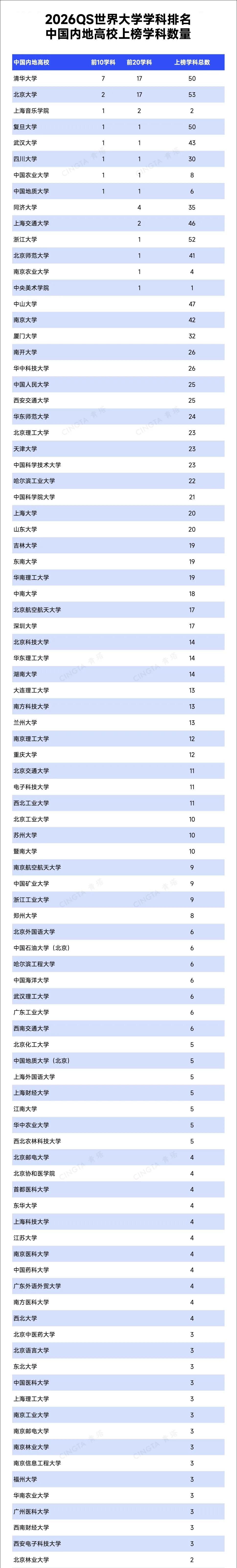 2026QS世界大学学科排名中国(内地)跻身全球前十的学科达15项,较2021年的7项增长逾一倍。清华大学拥有7个全球前10学科,数量上领跑内地高校。