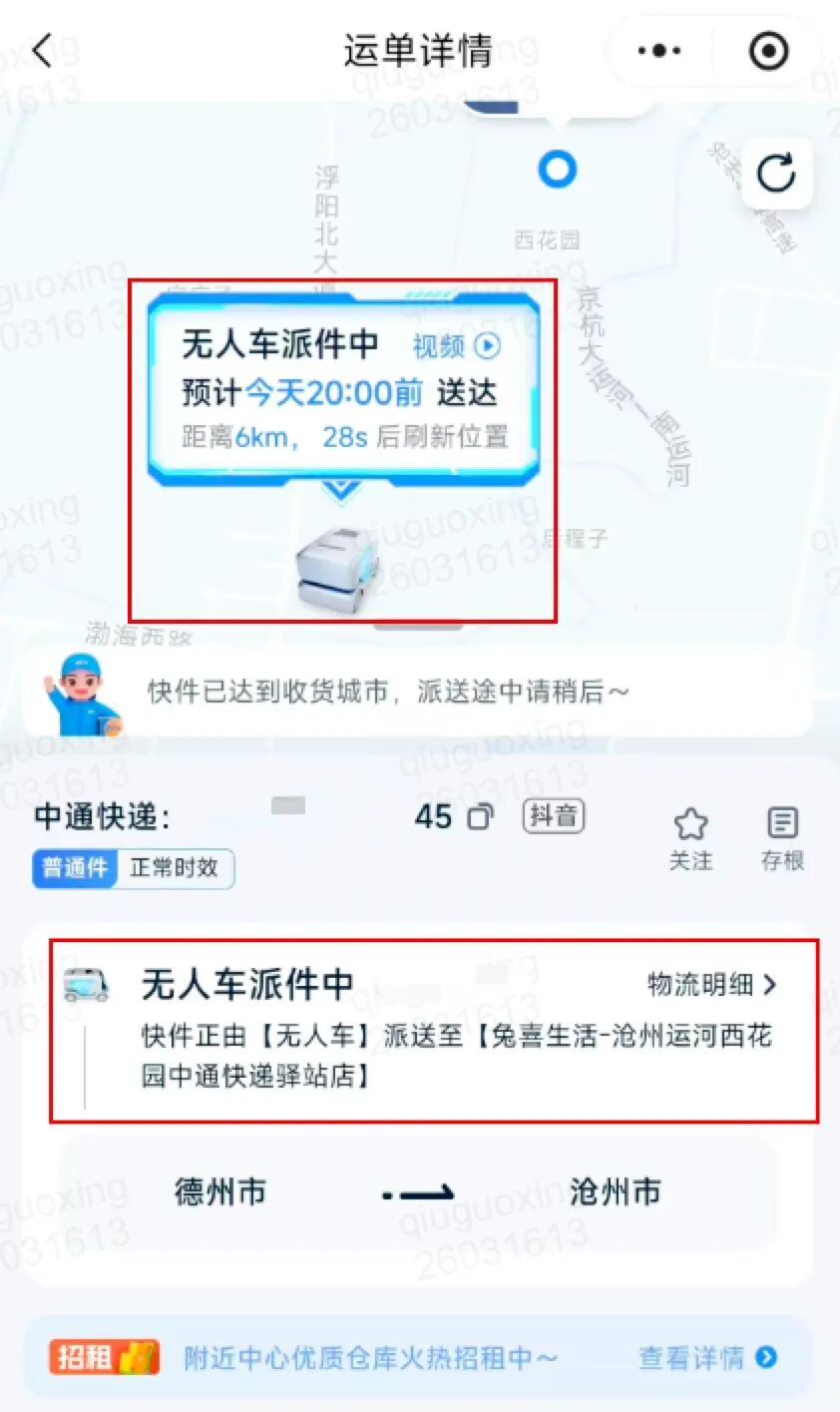 进入快件详情页,轨迹与地图上将清晰展示“无人车派送”标识,部分车型更提供“视频”按钮,点击即可实时查看无人车周边环境视频,了解包裹所在位置的实时路况与场景。