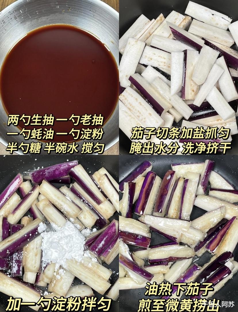 接着处理主角茄子。将茄子洗净切成条状,切好的茄子不要直接下锅,因为茄子就像海绵,直接炒会吸油。我们要在切好的茄子条中加入一勺食用盐,用手抓匀,腌制大约10分钟。这一步不仅能杀出茄子内部多余的水分,减少吸油量,还能防止茄子氧化变黑。腌制好后,你会发现茄子变软出了很多水,这时一定要用手或者纱布将水分用力挤干。挤干水分的茄子,不仅不吸油,而且更容易入味,口感也更软糯。