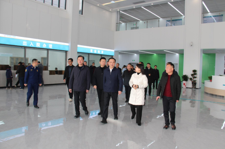 杨峰、刘洋等县领导实地察看了新院门诊大厅、住院病房、诊疗科室等区域,详细询问新院建设布局、学科设置、人员配置及设备运行等情况