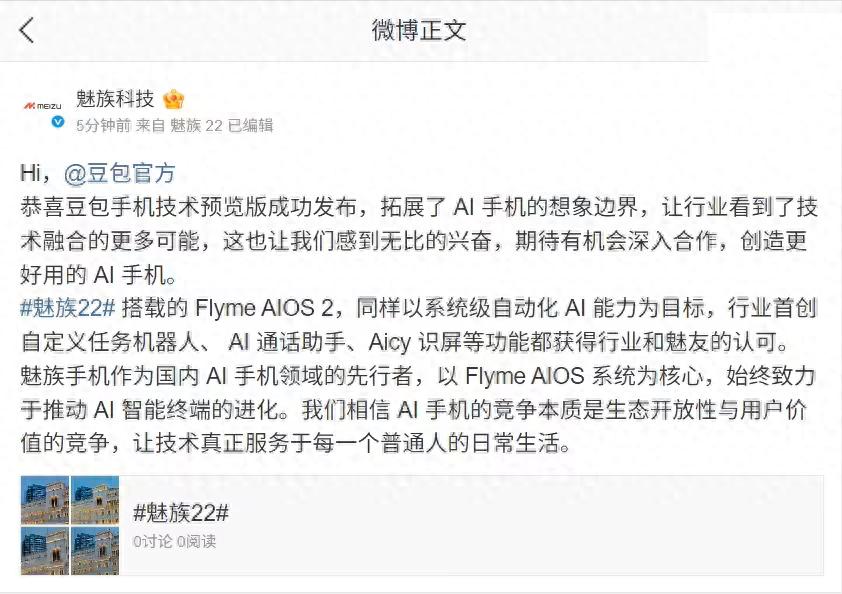 魅族科技还称:“期待有机会深入合作,创造更好用的 AI 手机。”