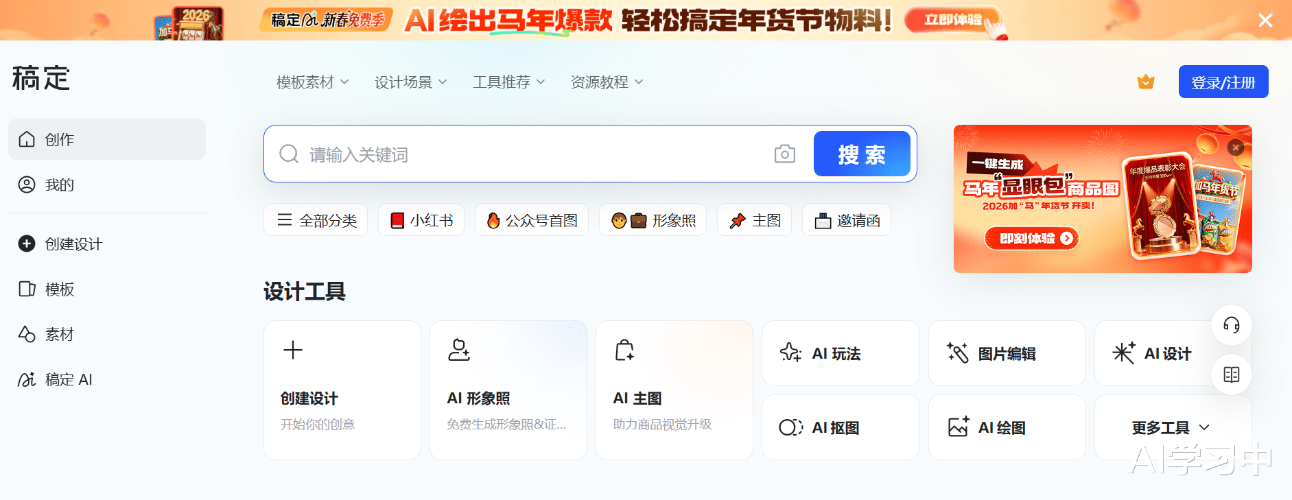 06 图形设计与创意:稿定设计(AI版)对于需要快速制作海报、社交媒体图片、 Banner 或简单信息图的职场人,稿定设计的 AI 功能堪称利器。