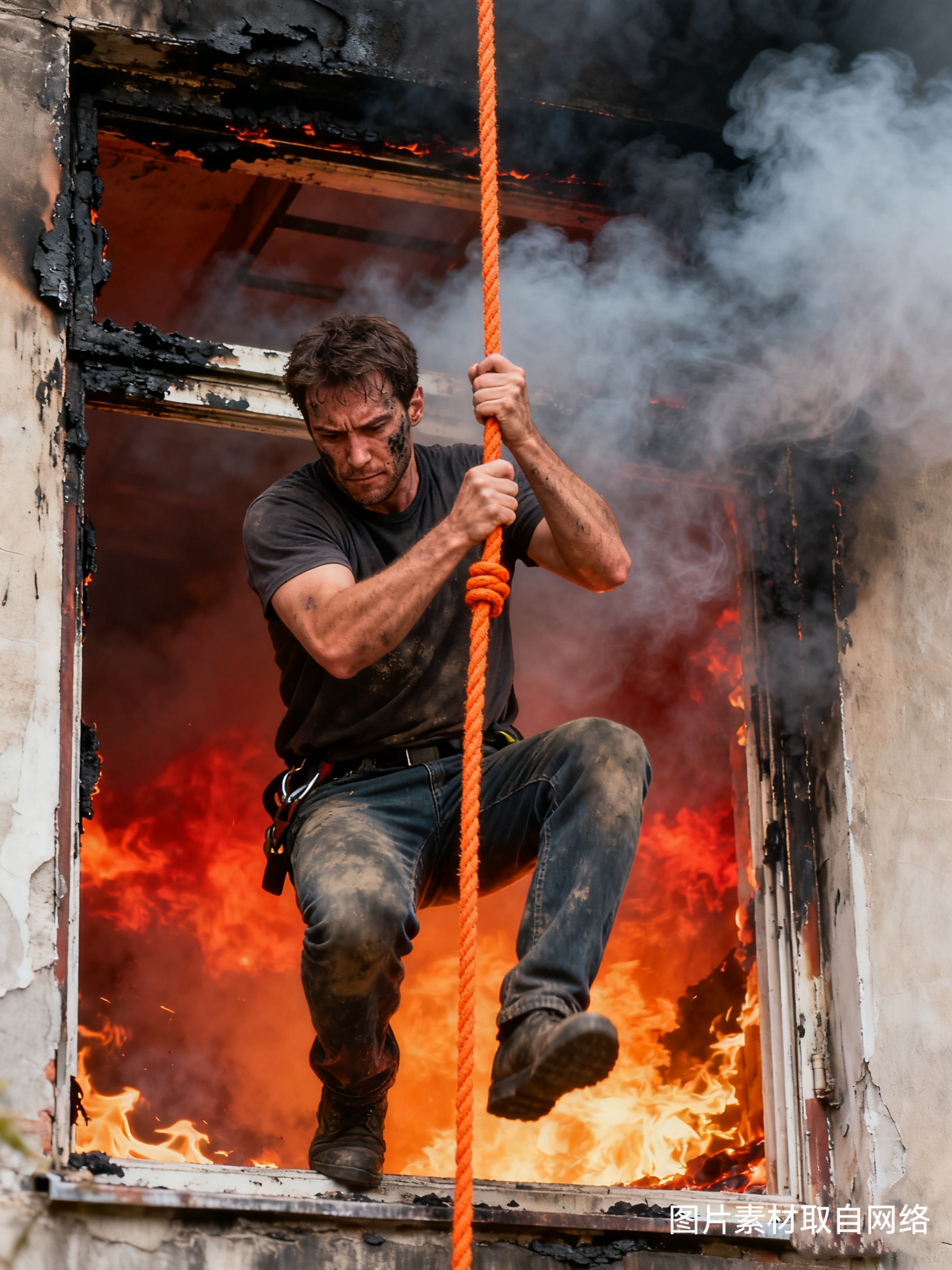 这两个错误千万别犯:①别把绳子拴在塑料防盗栏杆上,火一烤两分钟就融化,根本撑不住重量;②别图省事用攀岩绳,攀岩绳不阻燃,高温下容易断裂,纯属拿命开玩笑。