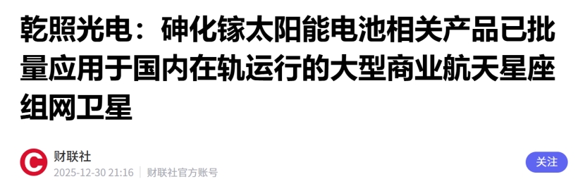 太空光伏:公司砷化镓太阳能电池产品出货量稳居国内第一,产品已批量应用于国内在轨运行的大型商业航天星座组网卫星如G60千帆星座等。