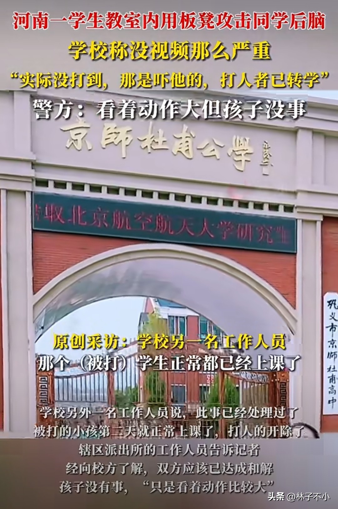 然而这个说法却被学校直接否定了,学校回应:“实际上没有打到,只是吓他的。”
