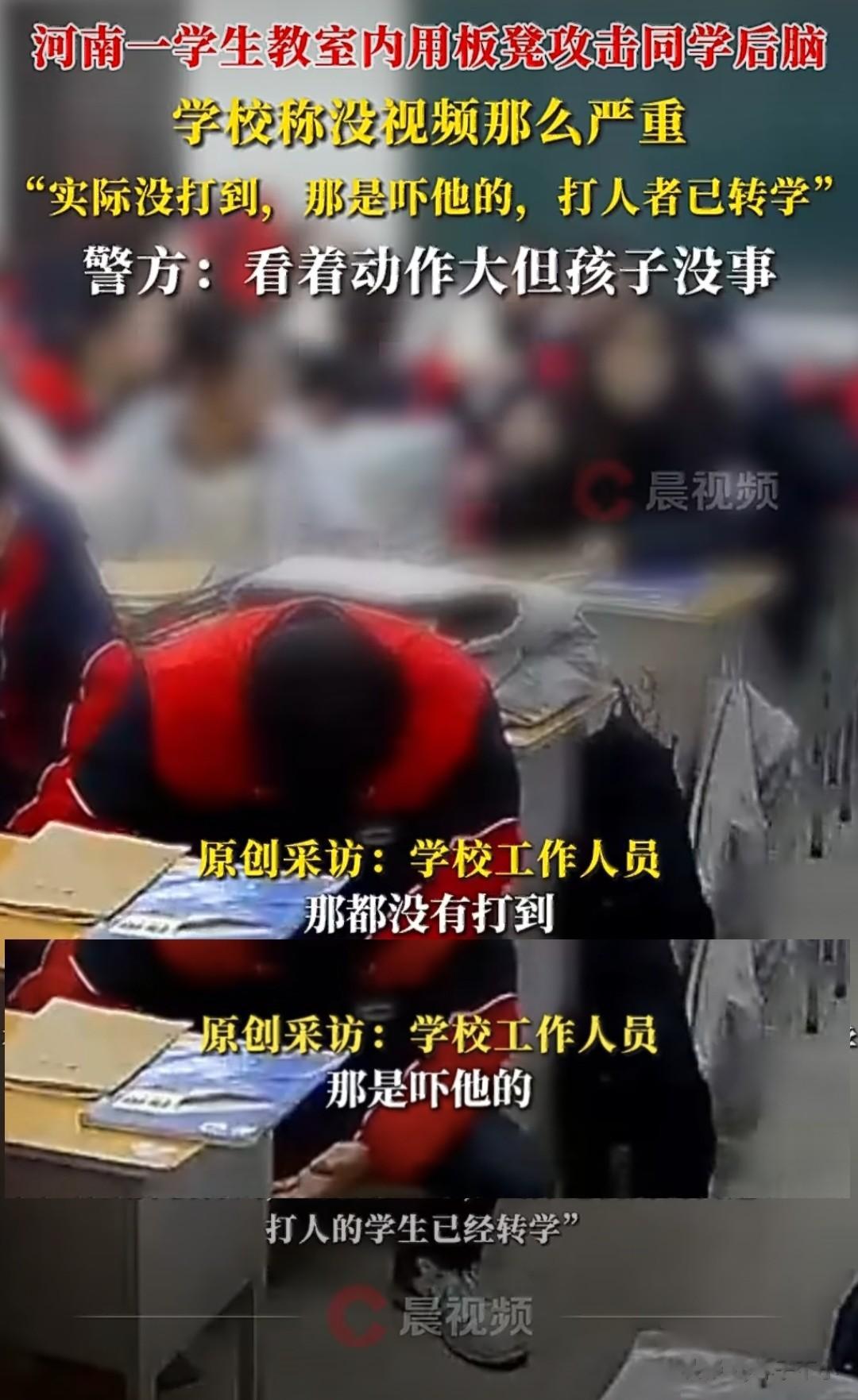 “一学生用板凳攻击同学后脑,同学倒向桌面,随后轻轻抬起脸,然后用手扶了扶眼镜,头就处于下垂状态。”这是监控记录下来的画面。