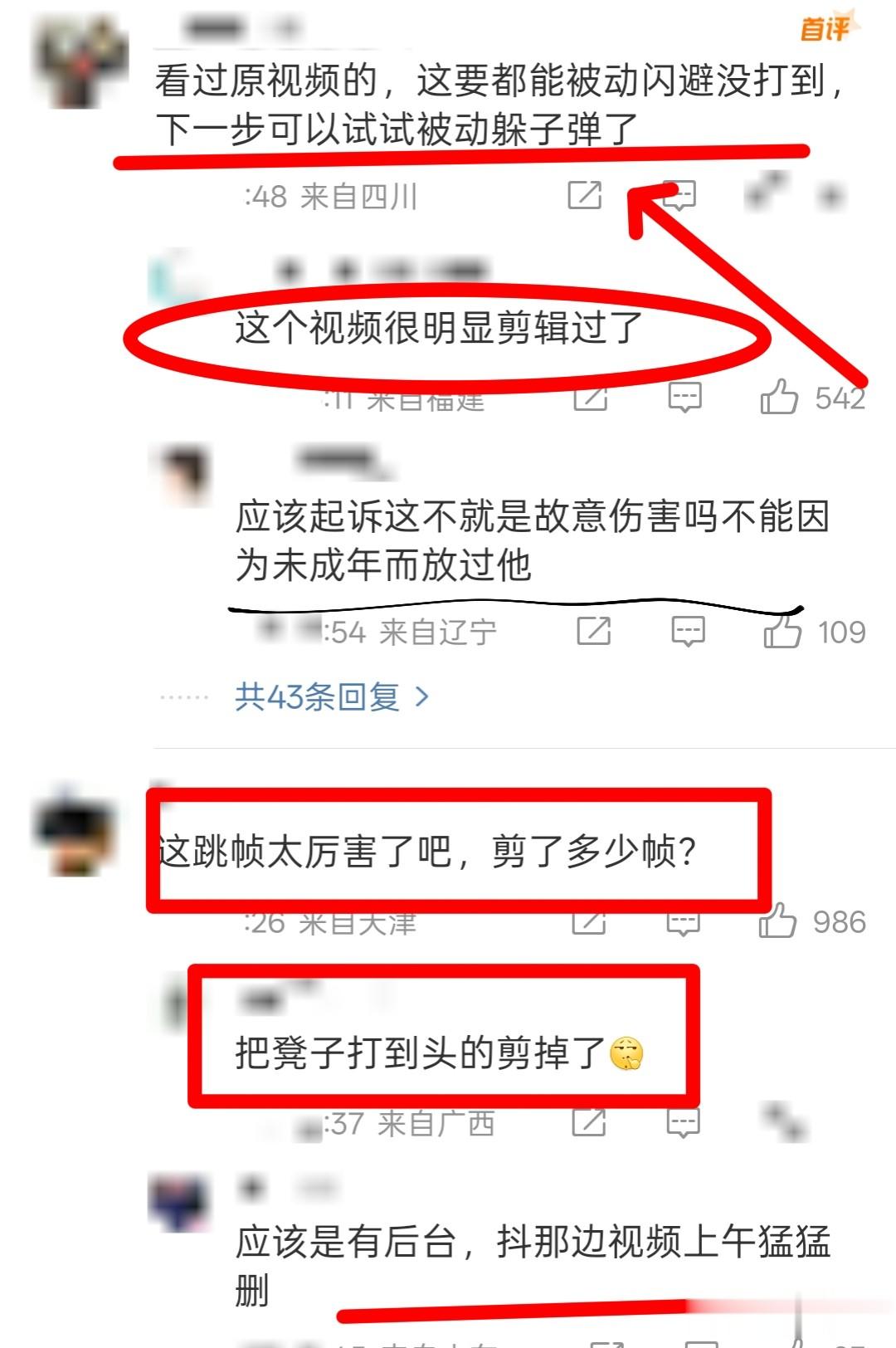 还有网友说:“凳子扬起和收凳子动作间明显有顿卡,之后坐着的那男生明显有些抽搐,怀疑视频被人为剪辑过。”