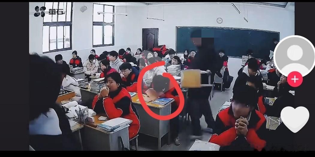 监控里听到一声“砰”的一声,然后穿红色衣服的同学就出现了头部倒向桌面的画面,疑似又出现了头倒向桌面后又反弹的现象。