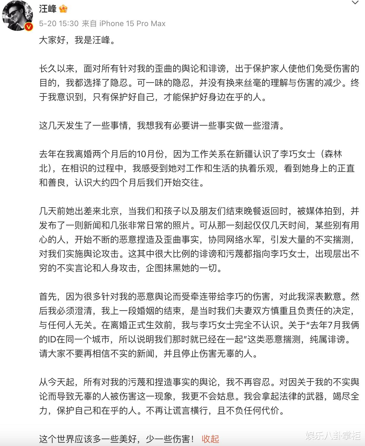 相比之下,汪峰则显得更为低调和注重孩子的隐私保护。据小道消息透露,汪峰之所以选择在这个时间点官宣新恋情,其中一个重要原因就是他无法忍受自己带孩子外出游玩时频频被偷拍的情况。他希望通过这种方式,让孩子能够远离公众的视线,过上更加平静和安宁的生活。