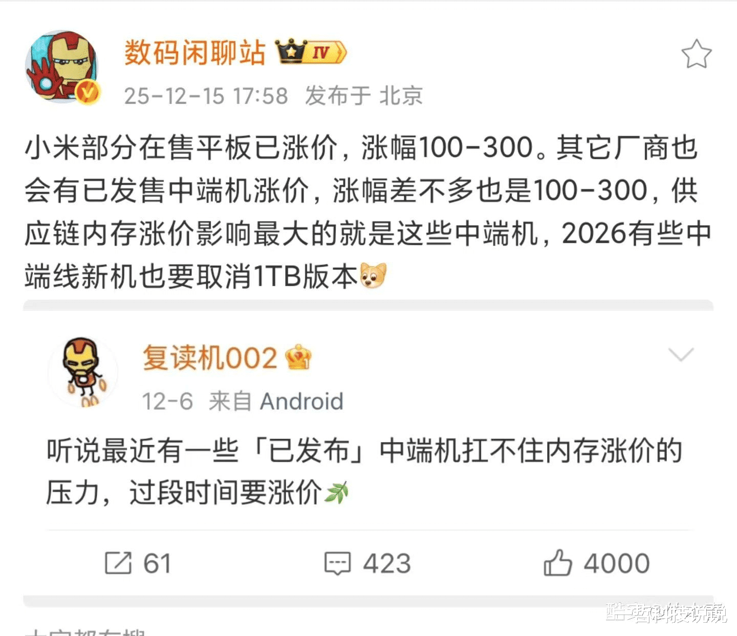 有博主爆料称,其它厂商也会有已发售中端机涨价,涨幅差不多也是100-300,供应链内存涨价影响最大的就是这些中端机,2026有些中端线新机也要取消1TB版本。