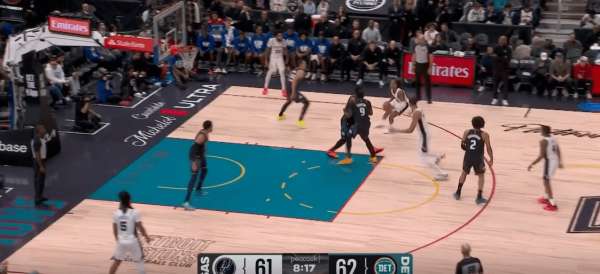 利用文班的顺下吸引活塞杜伦CC同时回收,福克斯顺势出球瓦塞尔命中弧顶三分: