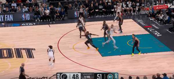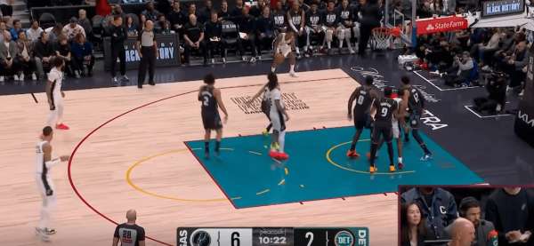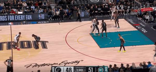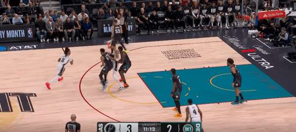 瓦塞尔罚球线附近借文班ram掩护,随后两人共同提上做double drag双掩护,