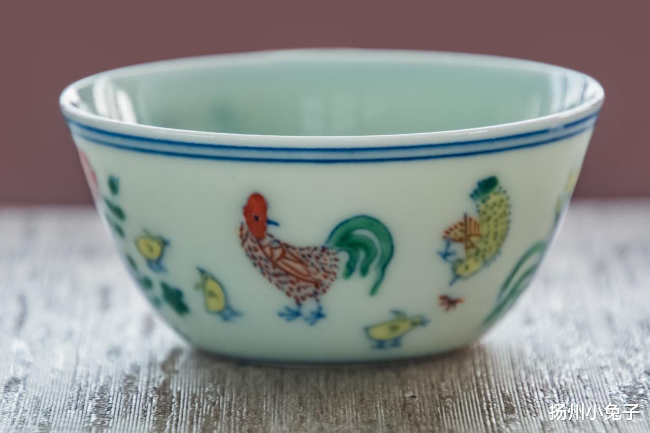 鸡缸杯,具有青花和斗彩两种瓷器要素,烧制极其困难。万贵妃喜欢小巧的瓷器,成化帝为了讨万贵妃欢心,不惜人力物力烧制。“小鸡食米图”的画面,有一种老母鸡护雏的意味吧。