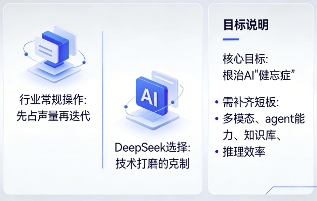 除了深耕LTM技术,梁文锋推迟发布还为补齐DeepSeek四大短板:目前DeepSeek仍是纯文本模型,多模态能力落后于同行;agent能力、AI编程能力与GPT、Claude等产品存在差距;AI搜索存在高幻觉率,依赖第三方接口导致信息源不可控。这些短板均需架构级优化,无法小修小补解决。